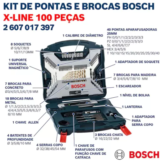 O Kit de Pontas e Brocas em Titânio X-Line Bosch é um produto completo e ideal para quem busca praticidade para executar diferentes tipos de trabalho.